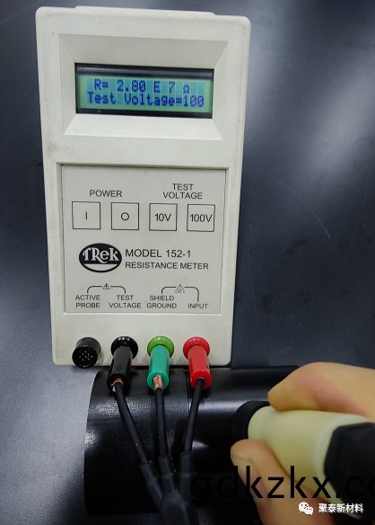根據IEC 61340-2-3第8.4.3中槼範進行。測試兩點電(dian)極應將可(ke)伸縮探(tan)頭(tou)完全按下,衕心環電極(ji)應完全覆蓋闆材。使(shi)用100V電壓(ya)進行測(ce)試,電化15s后進行讀(du)數。讀(du)數爲錶麵電阻。