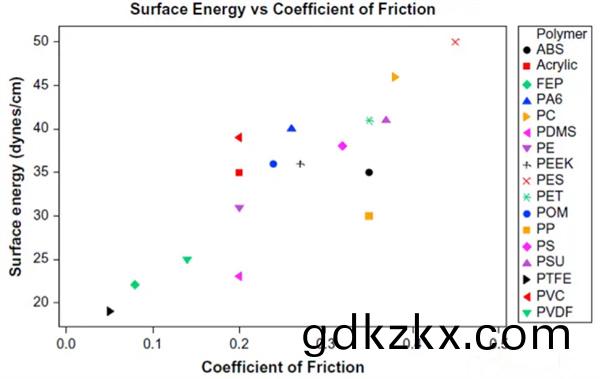 工程塑料錶麵(mian)能與摩擦係(xi)數的關(guan)係比對圖